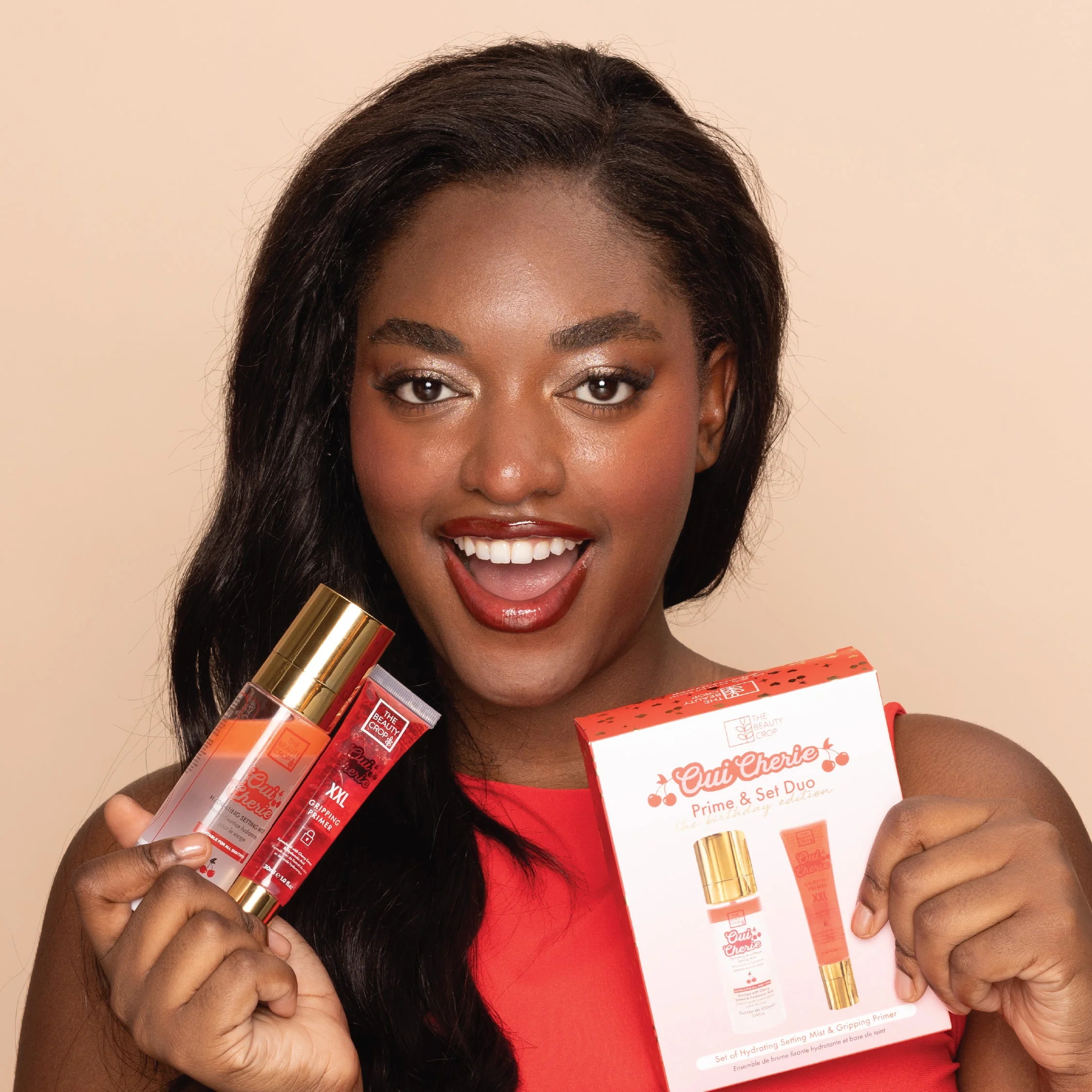 Ā Our Oui Cherie Prime & Set Duo is the ultimate dream team, combining our viral gripping primer and setting mist for makeup that looks flawless from start to finish. Packed with antioxidant-rich Cherry Extract and skin-quenching Hyaluronic Acid, these two are here to keep your skin perfectly prepped, hydrated and glowing.